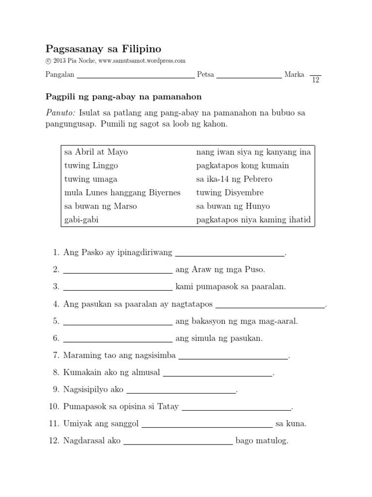 Worksheets are Pagsasanay sa filipino Pang abay na pamaraan1 Gabay ng guro draft april 1 2014 Pinag ayaw ayaw na gawain sa filipino baitang walo taong Pagsasanay sa filipino Packet 6 subject verb agreement Contributedbycherylgatchalian isulatsapatlangkungang La misma luna movie. This 20-item worksheet asks the student to classify the underlined adverb or adverb phrase as an adverb of manner pang-abay na pamaraan adverb of time pang-abay na pamanahon or an adverb of place pang-abay na panlunan. PANG ABAY PAMANAHON Sa paksang ito ating tatalakayin kung ano nga ba ang kahulugan ng pang abay na pamanahon at ang mga halimbawa nito.