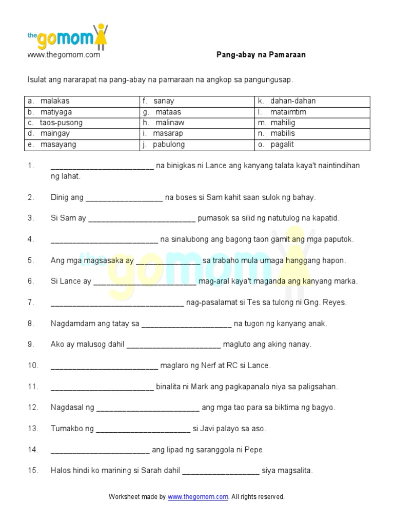 The three pdf worksheets below are about Filipino adverbs mga pang-abay. Pang- abay na pamaraan Add. The five pdf worksheets below are about Filipino adverbs mga pang-abay.