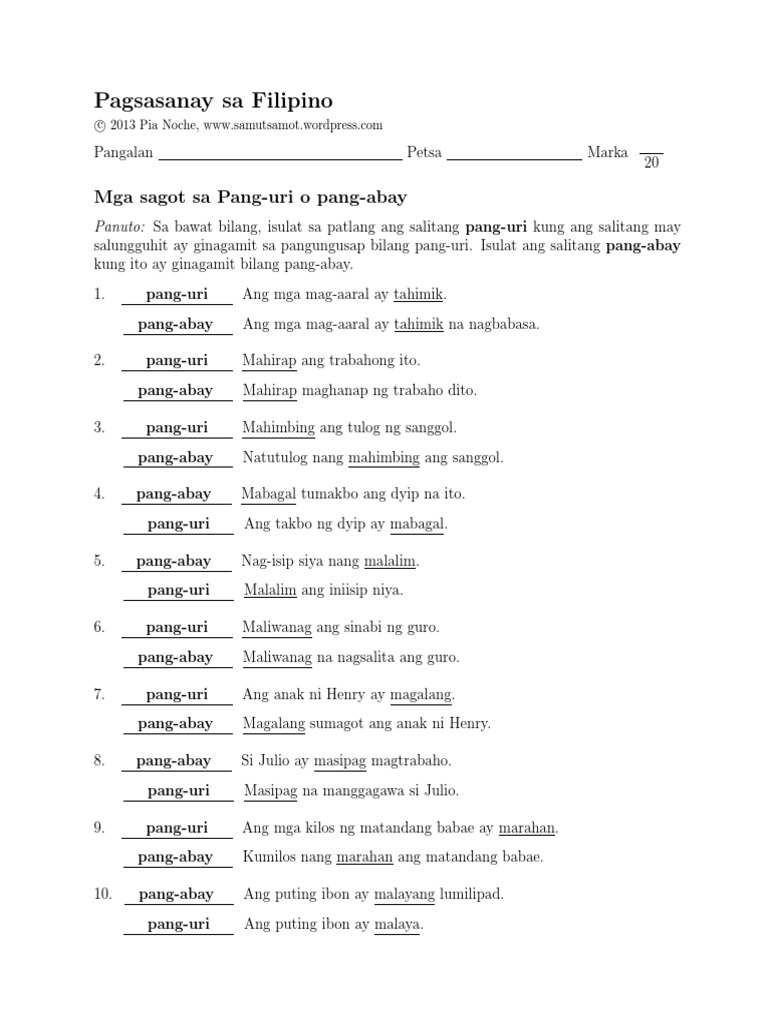 Each 15-item worksheet asks the student to underline the pang-abay in the sentence and draw an arrow from the pang-abay to the pandiwa verb that it describes. Pang-abay Worksheets Part 2 - Samut-samot Pang-abay Worksheets Part 2 samutsamotmom February 1 2013 Filipino Worksheets 7 Comments The five pdf worksheets below are about Filipino adverbs mga pang-abay. Some of the worksheets.