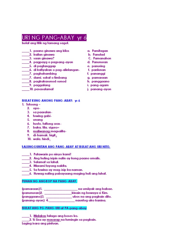 These worksheets are appropriate for fifth or sixth grade students. Mga sagot sa Pagkilala sa Pang-abay_1. Sampung taon siyang hindi umuwi mula sa ibang bansa.