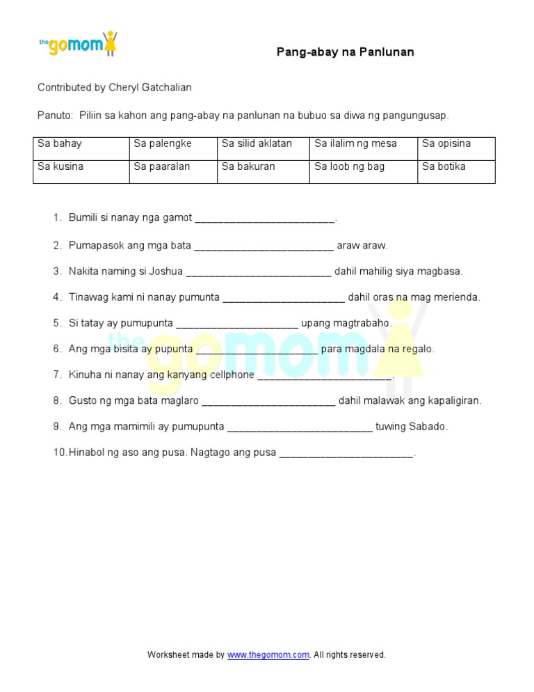 Ad The most comprehensive library of free printable worksheets digital games for kids. The three kinds of pang-abay in these worksheets are pang-abay na pamaraan adverbs of manner pang-abay na pamanahon adverbs of time and pang-abay na panlunan adverbs of place. Click on Open button to open and print to worksheet.