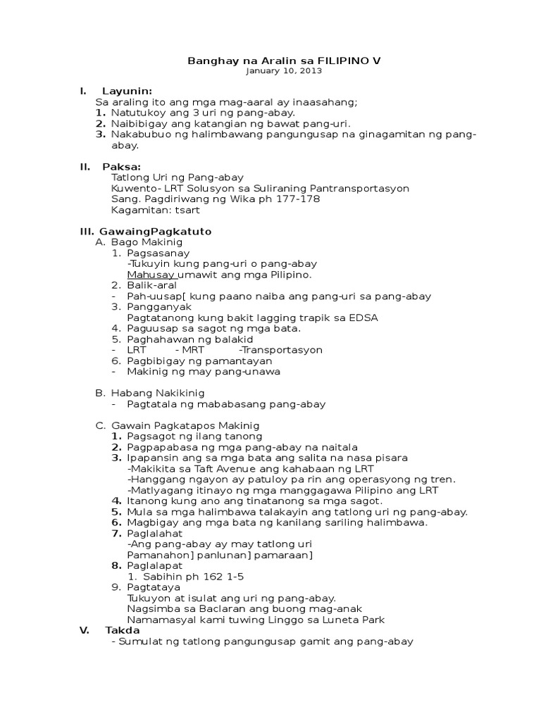 Banghay Na Aralin Sa Filipino 3 Uri Ng Pangabay 2 Pdf
