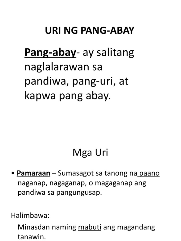 Ang pag-abay ay may tatlong uri - panlunan nagsasaad ng pook o kinaroroonan Pamanahon nagsasaad ng oras o panahon at pamaraan nagsasaad ng paraan. Ito ay ang bahagi ng pananalita na nag-uugnay sa pangngalan pandiwa panghalip o pang-abay sa iba pang mga salita sa loob ng pangungusap. Sumasagot ito sa mga tanong na paano kailan at saan.
